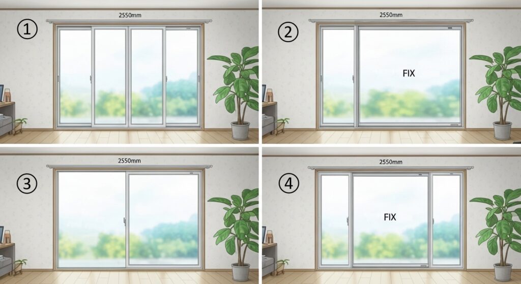 ④中央に大きいガラスがあるため、開放感があり眺めも良く、開閉部も楽である。左右に出入口があるので間取りによっては出入りがしやすい。一方で大きいガラスは交換費用が高くなることや、掃出し窓が2か所あるので気密性は②に劣る。